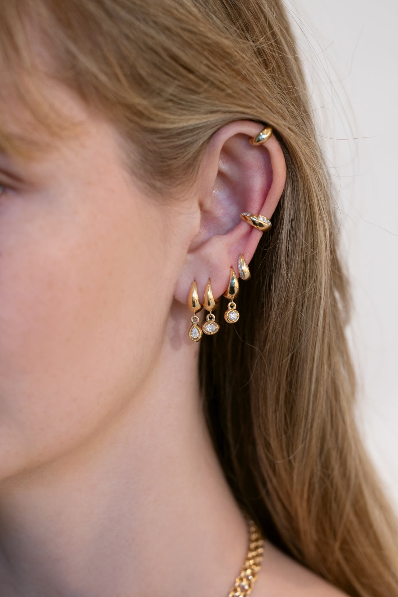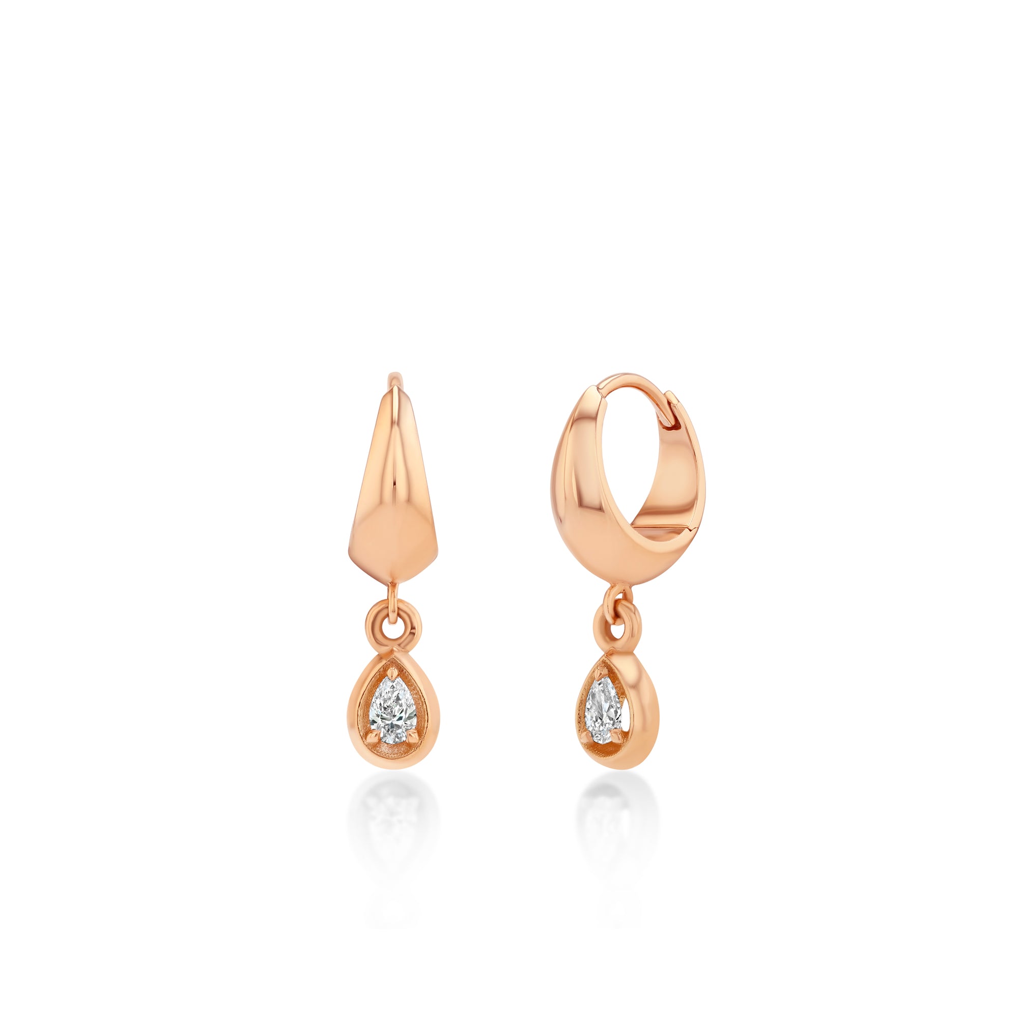 18k gold small crescent huggie with a dangle drop bezel pear diamond.
