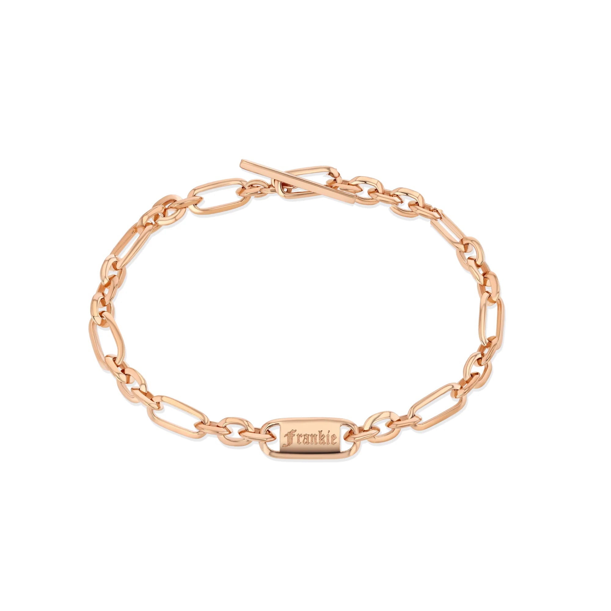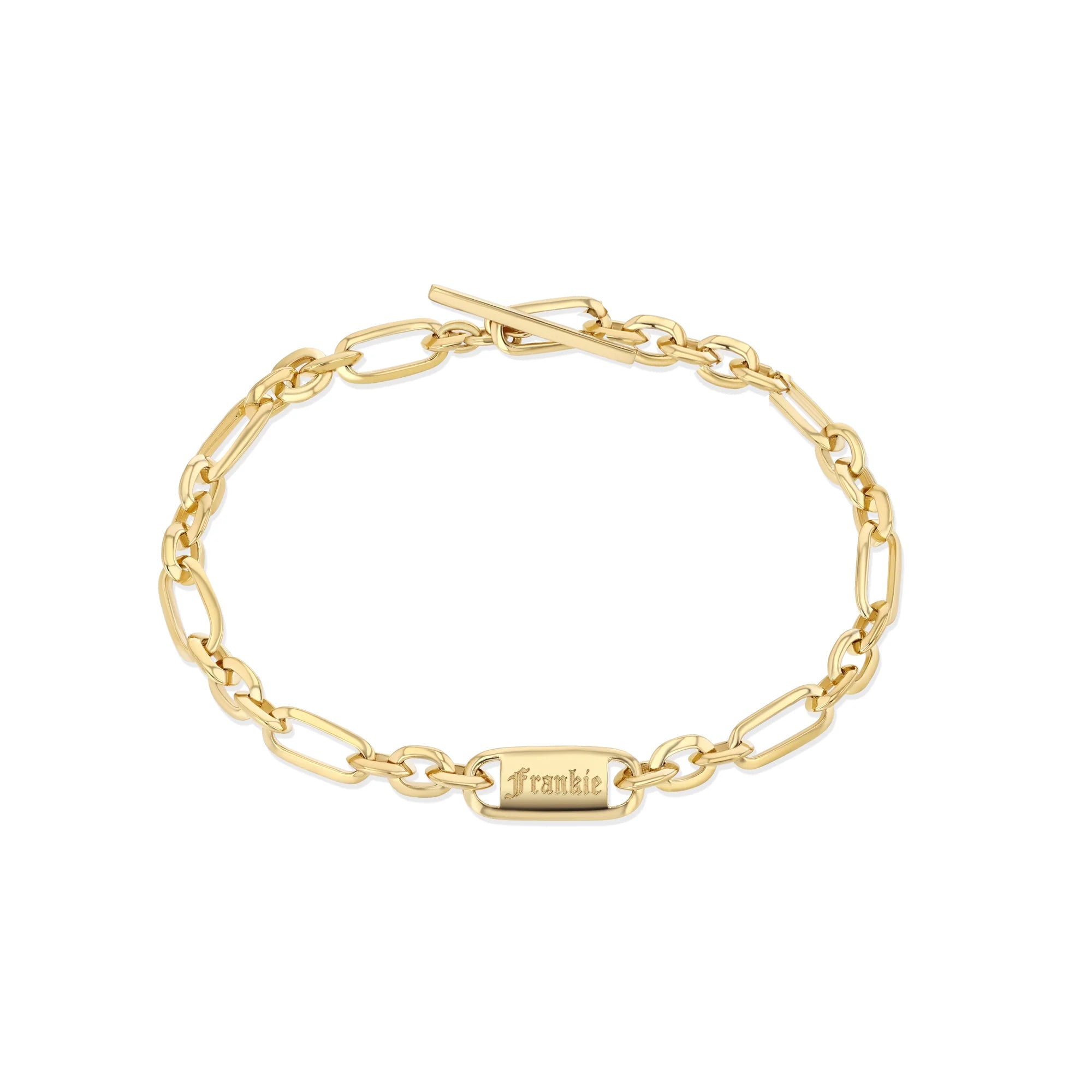 18k gold mini nameplate on our signature knife edge oval link chain. Length is 6.5" with toggle closure.