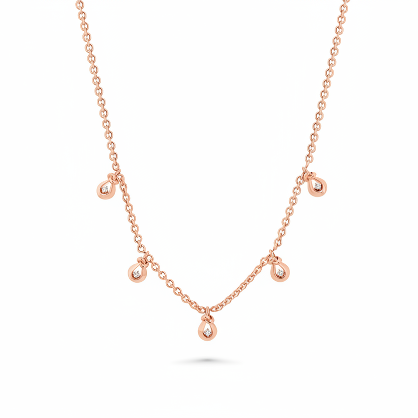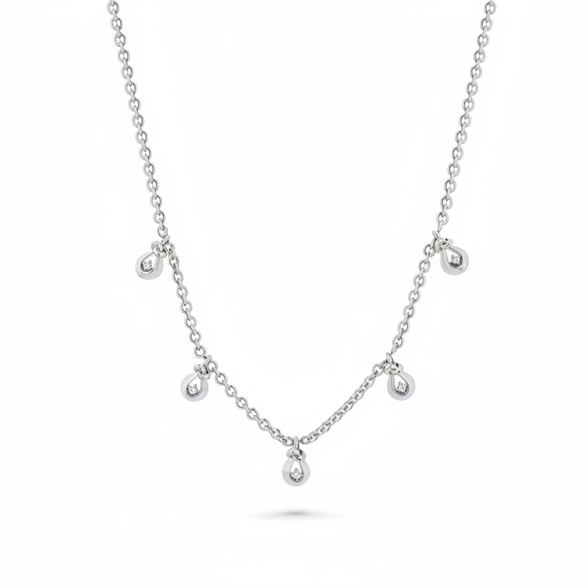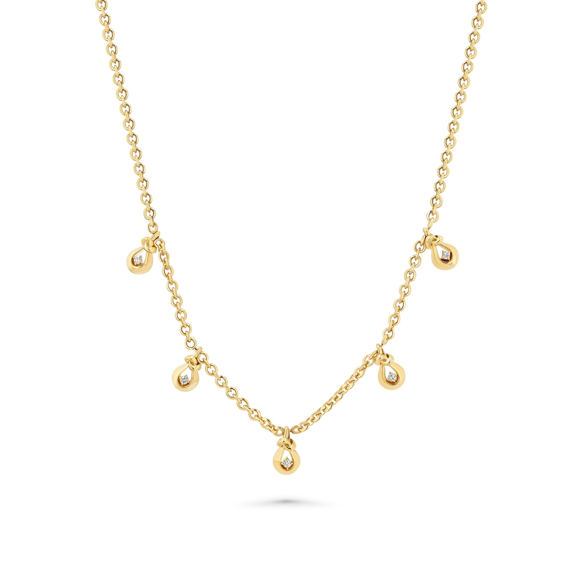18k gold micro link chain with 5 evenly spaced out love knot drops with round white diamonds inside each knot.