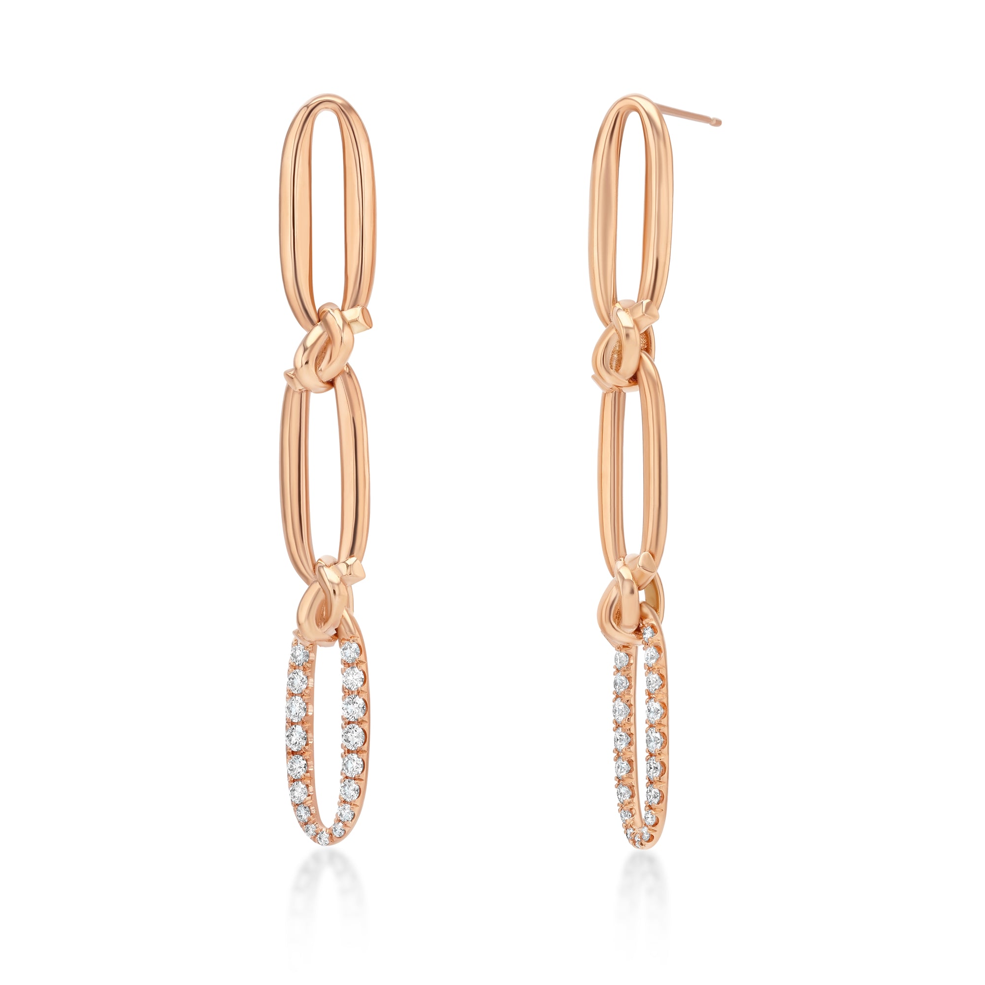 18k gold 3 drop flat link earrings linked together by love knots. Bottom links have a white diamond pave detail.