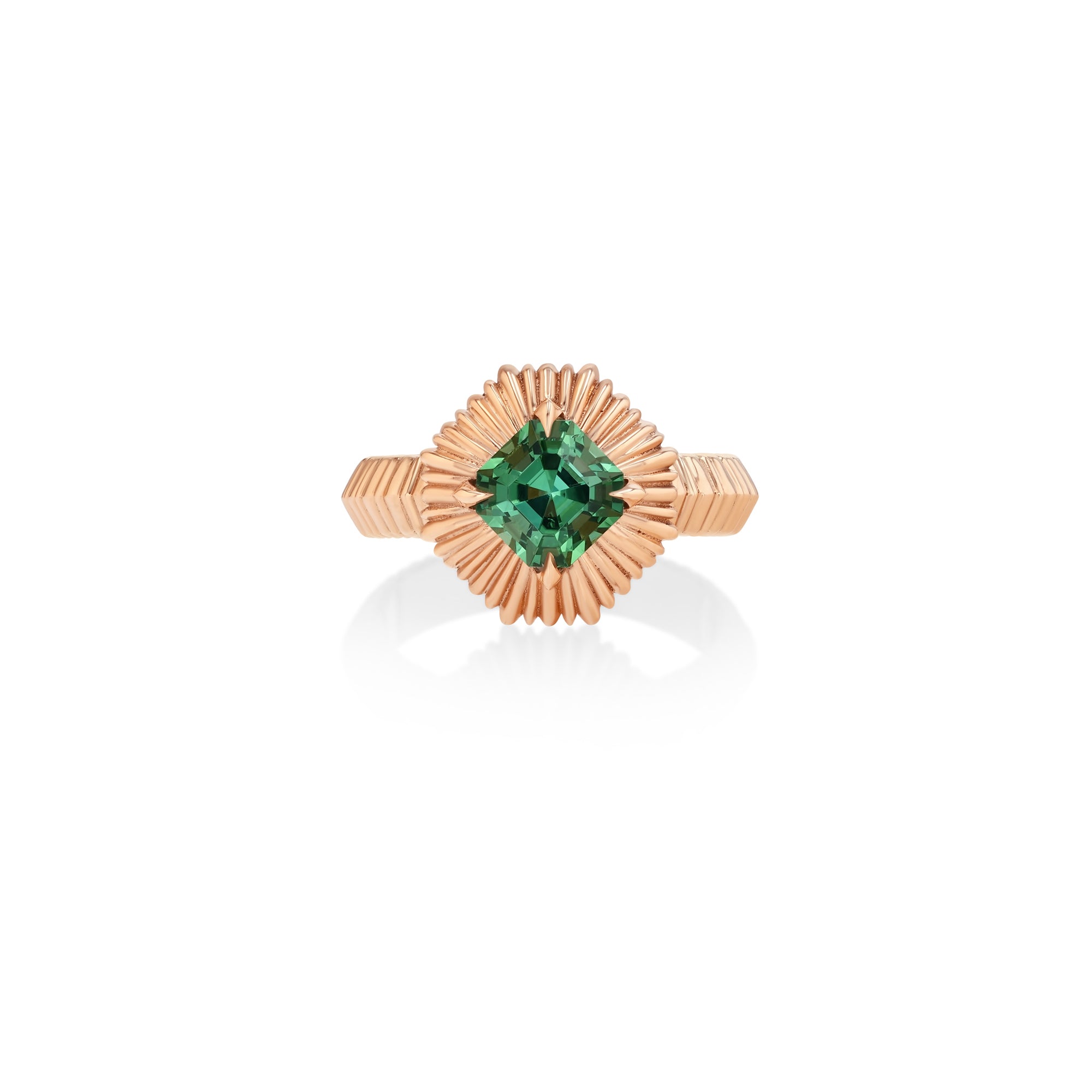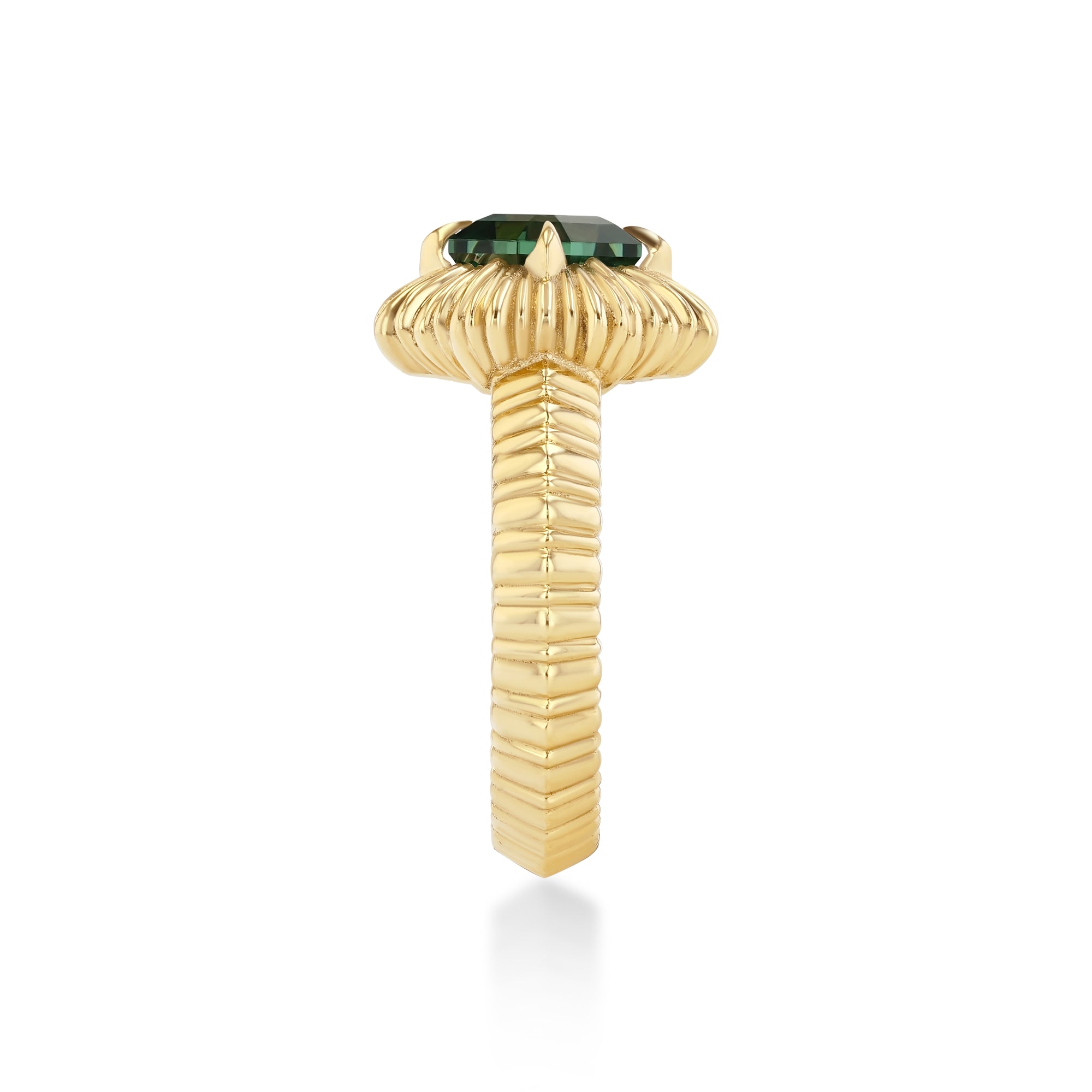 18k gold fluted knife edge band with a Fluted Hexagon bezel. Green Tourmaline weight is 1.42 ctw