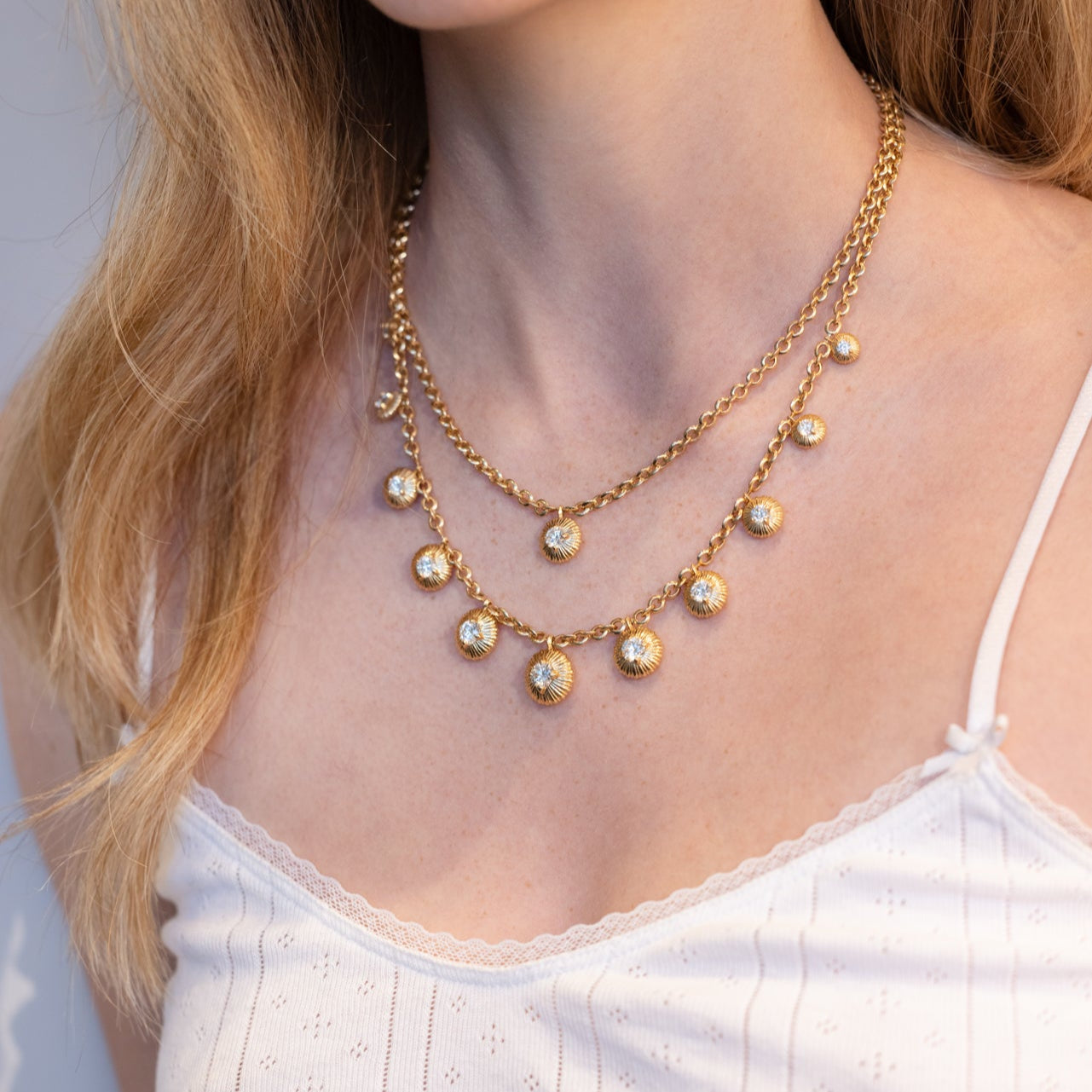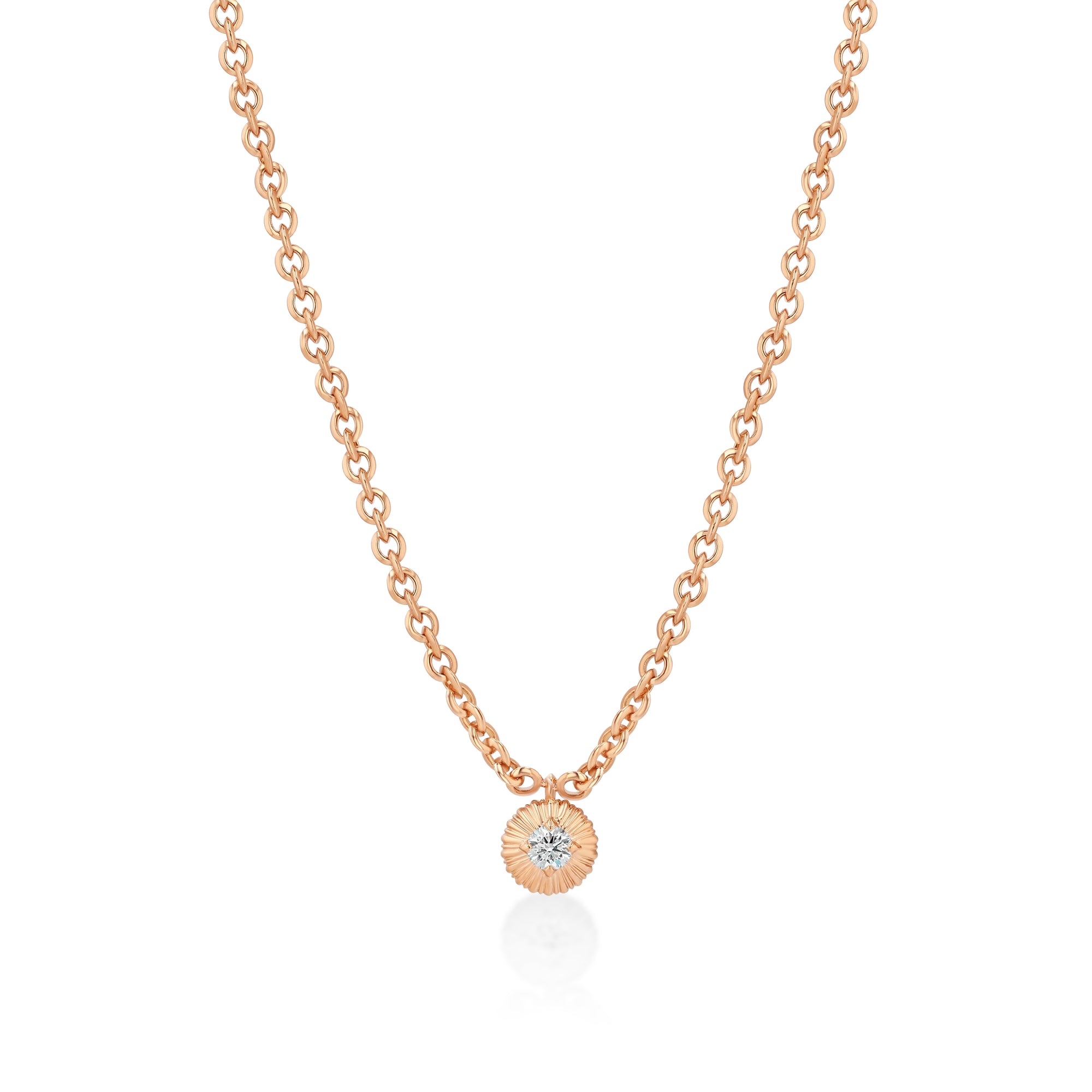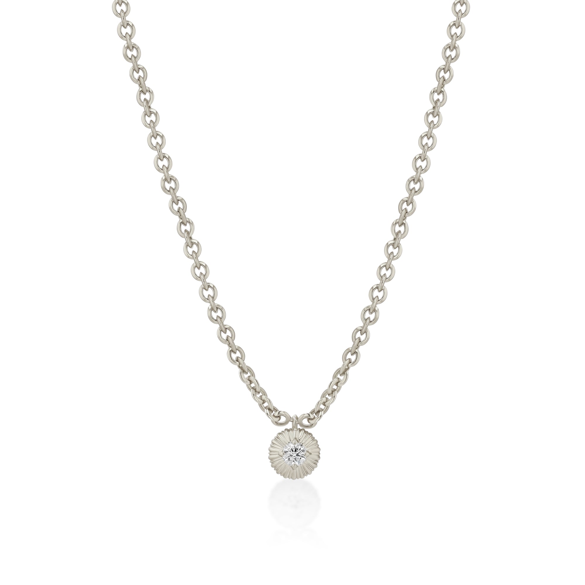 18k gold micro links necklace with a single fluted bezel diamond button. Chain is 16" in length. Diamond weight is approx. .50 ctw