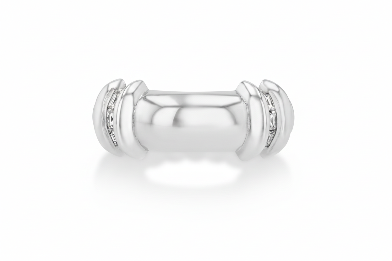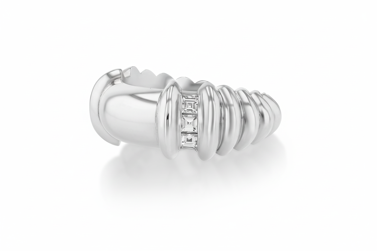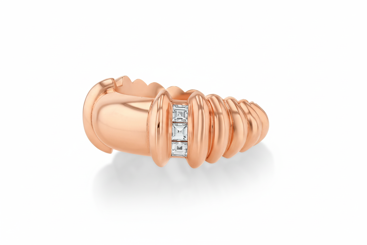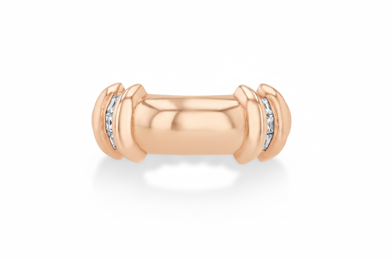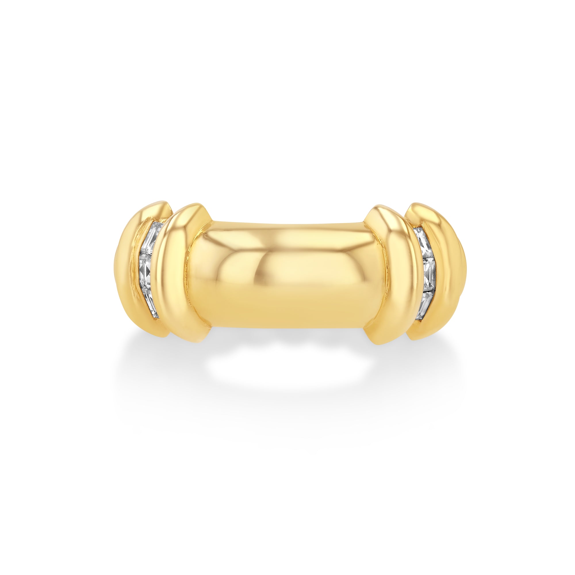 18k gold wide rounded band with fluted bars starting at the 3/4 mark and 2 rows of carre white diamonds