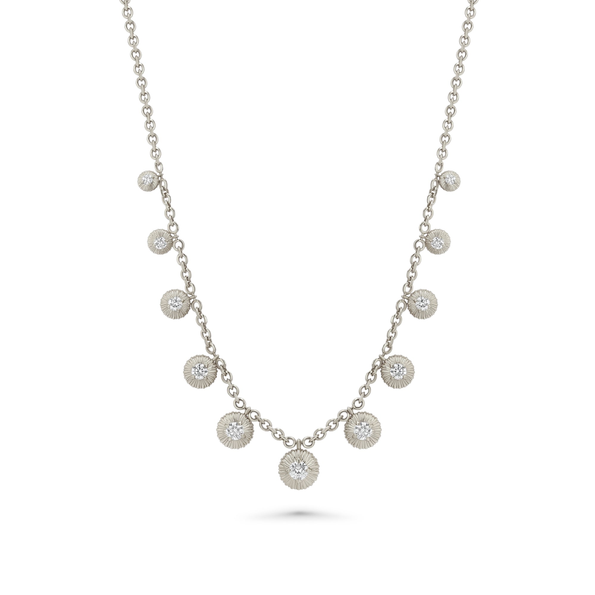 18k gold micro links necklace with 11 graduated fluted buttons. Chain is 18" in length. Diamond weight approx. 4.66 ctw.